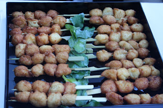 6º- A medida que nuestros invitados vayan sirviéndose, colocar el contenido de los recipientes y las fuentes medio vacías en otros mas pequeños. De esta forma los alimentos serán de nuevo frescos y apetitosos. O bien coloca desde el principio las comidas divididas en dos partes sobre el bufete. y Decorar con algo fresco, como puede ser una flor, o perejil, tomillo, albahaca en flor, etc)