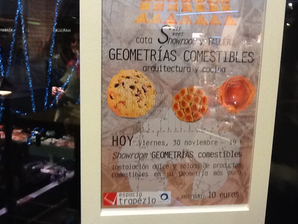 Hoy Sábado, en la misma sala, hay un Taller de GEOMETRÍAS comestibles, que se construirá con una base teórica arquitectónica y comestible y se realizará un análisis de las formas de presentación, la agrupación de elementos individuales, la suma, la adicción, la suplantación…
